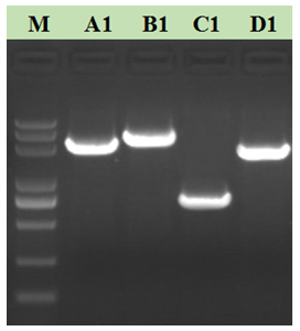 (A1: 人lncRNA某基因:2000bp;B1: 海帶某基因 2700 bp;C1:羅氏沼蝦某基因 750bp;大黃魚某基因 D1: 1900 bp)